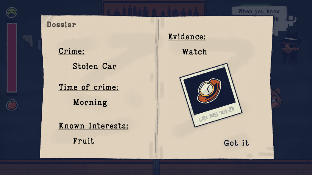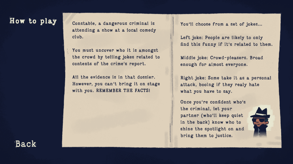 Constable, a dangerous criminal is attending a show at a local comedy club. You must uncover who it is amongst the crowd by telling jokes related to contents of the crime’s report. All the evidence is in that dossier. However, you can’t bring it on stage with you. Remember the facts!
